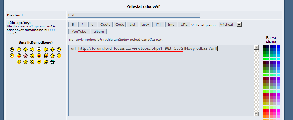 [1] pri psani zpravy oznacime text, ktery chceme pak videt jako odkaz a klikneme na tlacitko URL [2] vysledek bude potom asi takovy: [3] musime jeste zadat adresu, kam odkaz ma smerovat, tu vlozime za rovnitko (znak =) [4] muzeme se podivat na to, jak prispevek bude vypadat zmacknutim tlacitka Nahled [5] pokud je vse OK, prispevek odesleme tlacitkem Odeslat