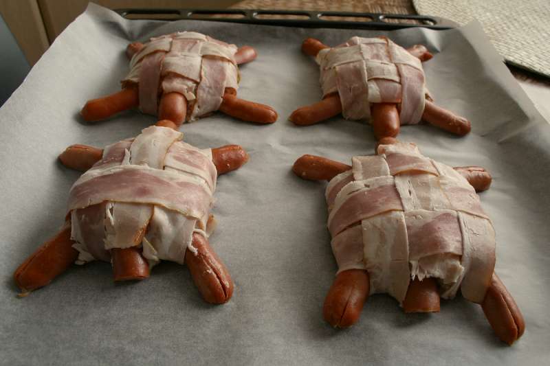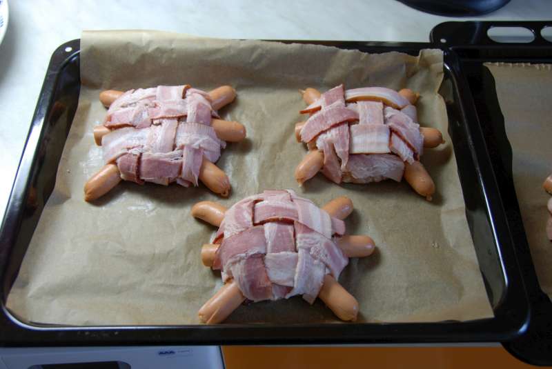 Pak vezmeme 6 plátků slaniny a překládáme přes sebe, abychom vytvořili strukturu krunýře. Co přesáhne, tak zasuneme pod želvičku :-) Výsledek můžeme ještě potřít rozšlehaným vajíčkem.