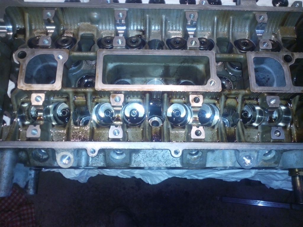 .Takže posílen studiem teorie tohoto motoru jsem začal objednávat díly.Těsnění pod hlavu 1250,-Kč, šrouby do hlavy 1080,-Kč, těsnění výfuku 200,-Kč, sada těsnění ventilových dříků 1100,-Kč, rozhodl jsem se pro pístní kroužky Goetze, ale bohužel v této zemi nějak nebyly k sehnání i když jsou nabízeny, pro eBay z Anglie za 2400,-Kč/sada na celý motor.Ještě nějaký ten tmel na motor celkem za nějakých 6100,-Kč.Vše krom kroužků je od značky VICTOR REINZ.Na fotkách níže uvídíte jak to dopadlo.Nálezy takové to: stírací kroužky na pístech úplně zapečené ven musely šroubovákem, těsnění ventilových dříků tvrdé jako kámen a po vytažení ventilů pořád drželi jejich průměr.Na obhajobu tohoto motoru musím říct, že válce opotřebeny max. 0,02 mm(mohou být  až 0,1 mm), žádné axiální vůle pístních kroužků, žádné poškození pístů.Oprava mi trvala s jedním kamarádem 25 hod. čistého času.Začali jsme v pátek odpoledne a v neděli už auto jezdilo.Pokud to vynásobíte cenou servisní práce cca 600,-Kč/hod a přičtete materiál je z toho cca 21 000 ,-Kč + náplně.Motor teď zajíždím dám mu cca 1000 km a pak vyměním olej.Zatím najeto 100 km bez jakýchkoliv problémů(nic se neztrácí)