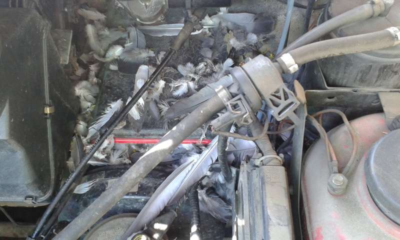 Něco podobnýho jsem našel jednou ve focusu, asi mi vletěl pod auto kos a semlel ho řemen od alternátoru. Našel jsem zobák, křídlo a trochu peří pod trubkama sání.