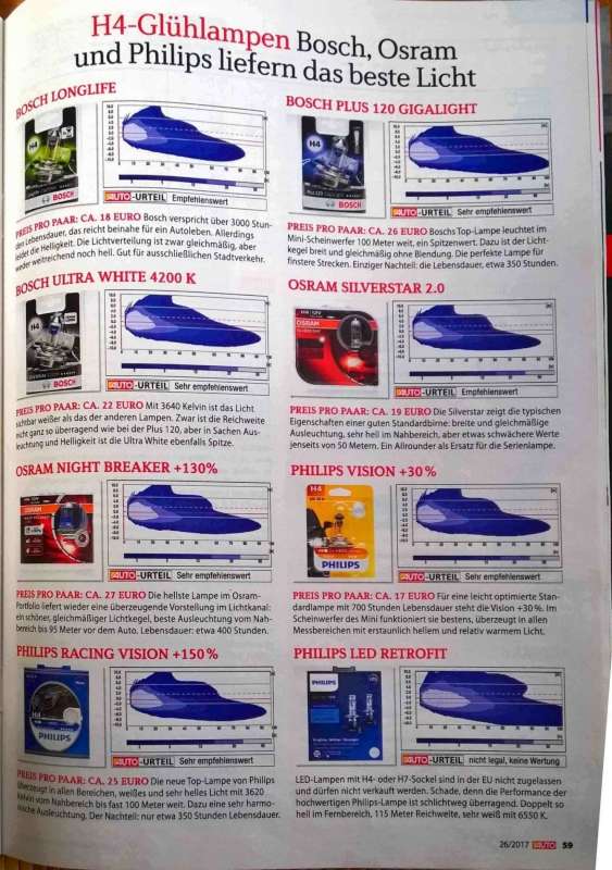 Dostal jsem nemecky casopis s porovnanim zarovek (H4). Pro zajimavost je ve srovnani i 100W zarovka a LEDka.