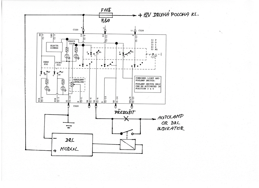 DRL modul připojený na tohle napětí pak ovládá relé.