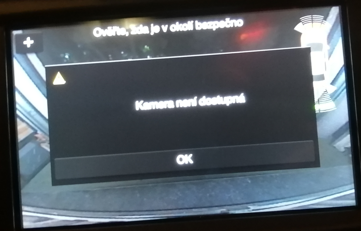 Kdyz vyjedu ven a stojim v zime treba 4hodiny, tak nastartuju, zacouvam, kamera zobrazuje obraz normalne, ale jakmile vyradim do neutralu a tudiz mi zhasne obraz z kamery na display (objevi se treba ovladani radia), tak se mi zobrazi okenko temer pres cely display, ze kamera neni dostupna -> viz prilozeny soubor.