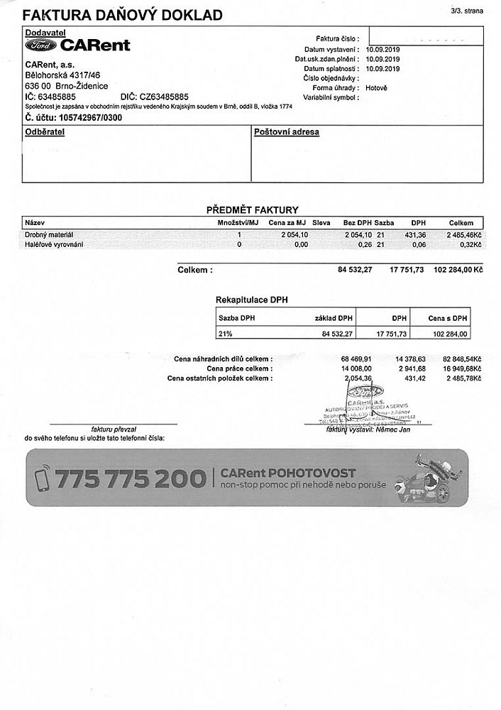 Zbylých 30% doplatil Ford. Pro zajímavost přikládám fakturu.