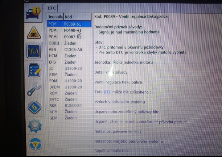 Riešim na kamarátov om mk2 1.8tdci problém, keď sa motor ohreje, tak ne štartuje. Točí aj 10sekund,niekedy naskočí až na 5ty pokus. Chyby v diag na fotke, teplota paliva ukazuje pred štartom okolo 40stupnov,po štarte cca 50. Tlak paliva pred štartom je cca 500psi po štarte drží na cca 30000psi.ventil regulácie pred štartom pri zapnutom zapaľovanie je zatvorení, točí a stále zatvorení, jak naštartovalo tak napísalo ze je otvorený...