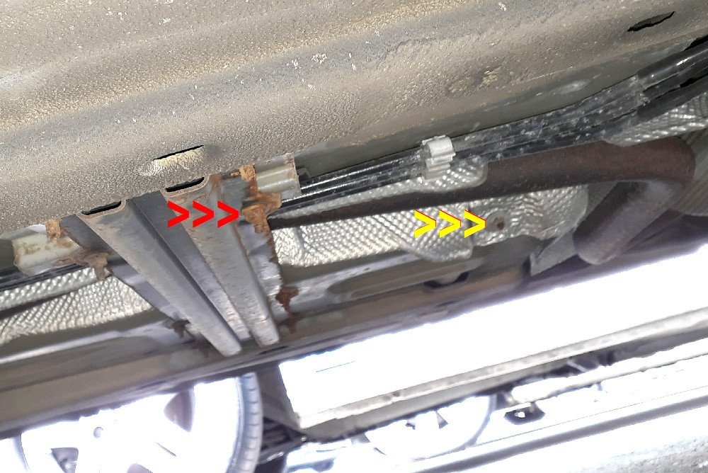 Kritické místo je např. příčka uprostřed auta, která zpevňuje podvozek a asi drží brzdové a palivové vedení. Na ní se může objevovat povrchová koroze a podle jejího stavu je možné usoudit, co auto "zažilo". U ojetin nad 10 let nezáleží už tolik na věku a km, ale spíš na podmínkách a péči (myčka, garážování atd.). Někdo se před prodejem (nebo kvůli STK) může snažit podvozkovou rez řešit ochranným nástřikem (ten je sám o sobě dobrý, ale musí se udělat pořádně), což ale může být jen "zakrývací" manévr. Lepší je podle mne vidět, jak to ve skutečnosti vypadá a ošetřit si to pak až sám. Zde je auto z roku 2007 se skoro 150 tkm ve výrazně lepším stavu, než auto z roku 2006, co má "jen" 95 tkm: Praktický tip - pohledem pod zadní nárazník na okolí tažného oka je možné rychle zjistit, jak to bylo s péčí o auto (bez ošetření to tam vcelku rychle rezne)- viz modré šipky na fotkách. Další slabé místo jsou úchyty žáruvzdorného krytu výfuku (žluté šipky), kde vlivem galvanické koroze (kontakt železo-hliník ve vlkhém prostředí) často urezne část plechu a ten se pak hýbe a drnčí za jízdy. Řeší se to většími podložkami pod šrouby (pokud tam jsou, už se o to někdo "postaral"). Tady je třeba ta příčka v dost špatném stavu, zatímco úchytu výfuku naopak v dobrém...