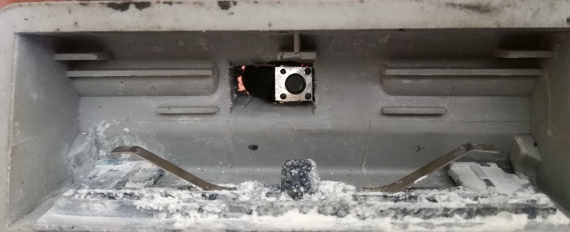 Rozebral jsem to madlo s mikrospínačem. Topilo se to v krémové vazelíně. Mikrospínač byl podle mého přesvědčení nefunkční, šroubovákem jsem ho lehce vypáčil ven a po shlédnutí, že pod ním jsou pouhé tenké zaoxidované mikroplíšky, které se už nejsou schopny navzájem dotknout svým 0,1mm kontaktem, jsem je vyhodil včetně mikrospínače.