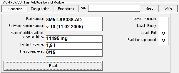 to co ukazuje elmconfig z FACM o tom moc neviem nikdy som nemal dovod s tym laborovat a IDSa ukazuje este menej dat . Ale najskor to co ukazuje je len vypocitavana hodnota /ten reset aditiva ju len virtualne naplni/ . Dokial nepoklesne hladina pod urcity limit riadi sa podla vypoctu, az pod hladinou signal z pieza bere ako malo aditiva a FACM vytvori DTC . Tak nejak ak si dobre pamatam je to v manualoch. Odpoj nadrzku aditiva a uvidis.