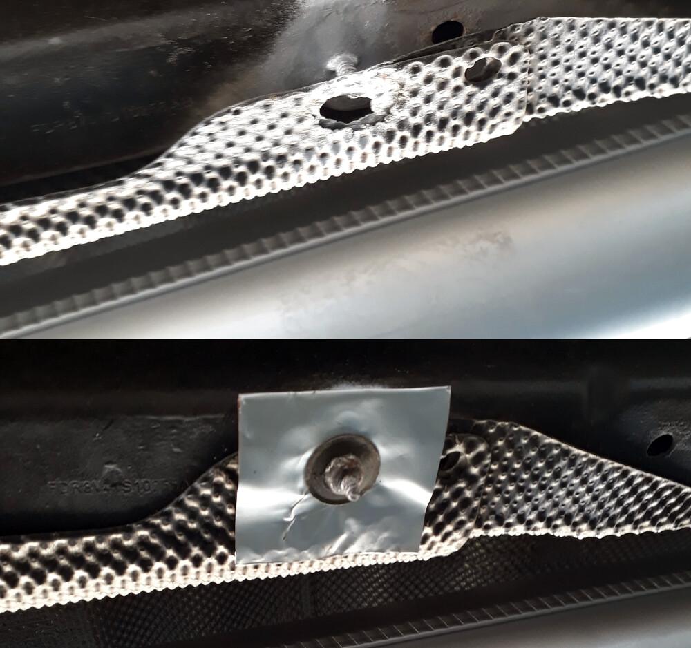 Podložky na šusplech stříhám ze starý hliníkový lopaty (duralovej plech 1,8mm) a místo tý plechový matky normální M5 matičku., když mám po ruce tak to podmáznu silikonem proti drnčení, stačí tečka, silikon zásadně neutrální. Nebo barvou, Alkyton je taky lepidlo