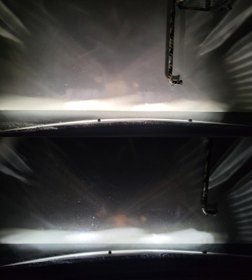 Je to zvláštní, čipy jsou na téhle Osram H7 do strany, čekal bych, že bude tmavší oblast přímo před světlometem. Třeba je to vidět na zdi / regloskopu, třeba taky vůbec - tím, jak se osvětlení skládá z odrazů jednotlivých plošek světlometu.