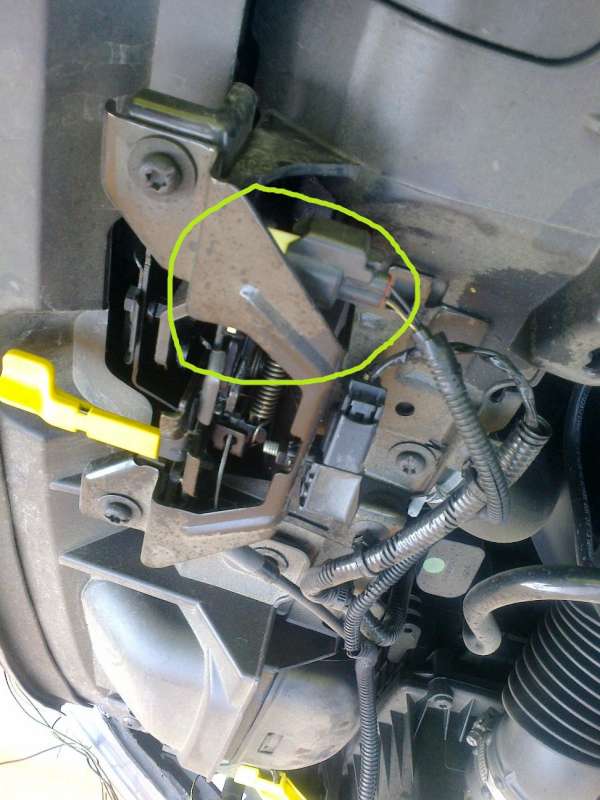 - koukneme se na zamek kapoty - na fotce je videt bile cidlo a z nej vedouci kabel => mame vyhrano, staci vymenit bile cidlo (nema senzor uzavreni kapoty; je to jen plast) za cerne (ma senzor uzavreni kapoty)