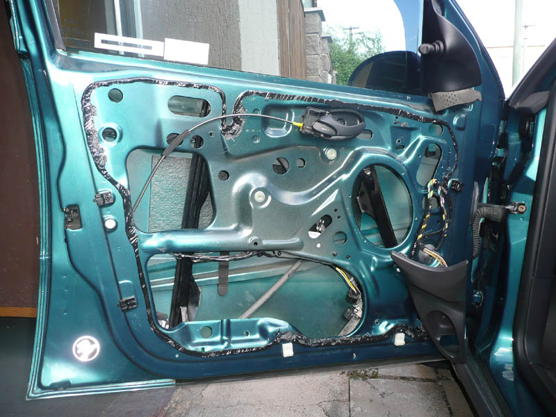 Slabší nátury si smlsnou už při odlepování tapecírunku od tý matlavý černý hmoty při snaze zachovat ji alespoň trochu při sobě (první myšlenky dezerce) Po překonání této překážky a vyndání stahovačky ven po letmém prohlídnutí se ukázala závady.Byla prasklá jedna z umělých hmot.Na fotu je jezdec z druhé strany kde byla jen naprasklá jedna packa. Tu jsem nahradil kouskem umělý hmoty s vyříznutou drážkou prostě tak aby plnil původní funkci,přišroubavaný jedním samořezným vrutíkem.Na druhý straně byly tyto packy obě,ale jedna už naprasklá a bylo by jen otázkou času kdy by umřela taky.Tu jsem vyztužil plechema v místě kde byla hmota prasklá pájkou roztavil-zavařil.Zkoušel jsem na to nakapat roztavenou jinou umělotinu,ale ta nechytala (šedá hmota.)No a taky tam byl prasklý jeden konec chlívečku na zarážku co je na lanku tj.okno by dolů táhlo,ale nahoru by jelo lanko samotný hmotu by netáhlo (každý,kdo se do toho pustí či pustil ví o čem je řeč) no a to jsem taky spravil kouskem plechu.Víc fota. Každopádně nejhorší na celé opravě bylo zamotaný lanko na kladce.To bylo fakt hustý! Samozřejmě se pokroutilo.To jsem co nejlíp porovnal kleštěma,pozor na sploštění.Dřív se však musí sundat motorek s mechnismem to jsou tři torx šroubky,kladka jako taková sundat nejde.Potom ručně navinout lanko tak jak má být a vrátit motorek,následovalo nasazení lanka na všechny kladky jde to blbě,ale na vrchu zelené kladky je šikovný excentr,který velice usnadní konečné nasazení.Během celý operace jsem několikráte potřeboval elektricky popojet s lankem ( s motorek lankem nehnete) tady jsem využil svůj laboratorní zdroj z minulosti kdy jsem ještě kutil elektroniku protože přenášet celou stahovačku ke dveřím je nepraktický otravný a špatně se s ní pracuje.Pozor! na jakékoliv popojíždění poku ještě lanko není nasazené na VŠECH kladkách si vemte pomocníka,který vám bude lanko napínat,nebude-li napnuté bude se špatně navíjet (přes sebe) a můžete začít znova.A jak máte lanko na místě je vyhráno.Potom nějakým způsobem dostat stahovačku do dveří na své místo máznout vazelínou ( já grafitovou) a můžete si mnout ruce,že jste ušetřily 8500 kaček + práci v servisu,nebo v lepším případě 1500 za stahovačku o které nic nevíte a jejíž životnost je ve hvězdách.Mě to nestálo nic krom pár pivek.Jiná otázka je jaké moje práce bude mít trvání.Každopádně v případě problému dám vědět.Jo a ještě jeden dojem stahování je o proti dřívějšku krásně tichý paráda.
