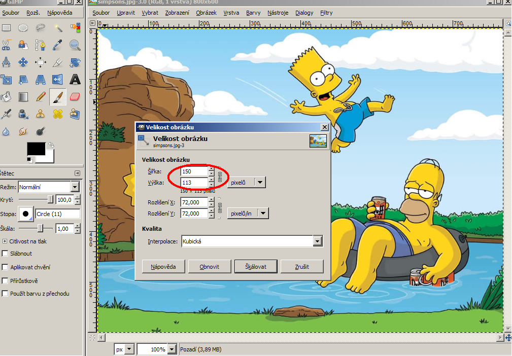 [2] pravym tlacitkem mysi klikneme na otevreny obrazek a vyberem z nabidky Obrazek - velikost obrazku [3] zadame pozadovanou velikost (150 pixelu) do jednoho policka, druhe nechame "svazane" s prvnim [4] zmackneme Skalovat