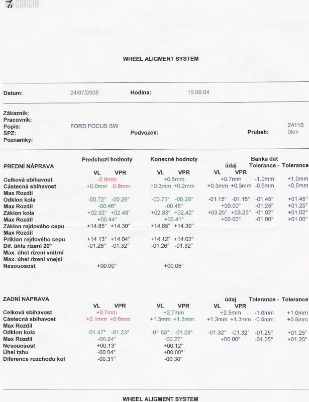 PS: Auto je dovoz z DE pred kúpou geometria - odklony, zákolny, jazdné uhly jednotlivých náprav i výsledná jazdná os OK, nastavená zbiehavosť do zelených polí a zdanlivo v poriadku. Kým som nešiel po "mačacích hlavách" asi 80-90km/h a zadok si chcel robiť inú trajektóriu - bolo to v lete. Potom som rozmýšľal - bola to kamerová geometria možno mechanikovi spadla kamera, alebo nie je dávno ciachovaná - šiel som na novú Bosch 3D geometriu - všetko ok, donastavili mi zbiehavosť pravé predné kolo a všetko v zelenom poli ale zmena iba minimálna. Síce nutné podotknúť, že ľavé zadné ja na hranici tolerancie, ale ešte v schválenom zelenom poli- to bolo na začiatku zimy. Tlmiče - pred 2týždňami absolvovaný tester tlmičov najnovší v NR s novým soft-upgrade a výsledok: predné tlmiče ok, zadné oba v zelenom poli, ale pravý na jeho okraji....ale stále nie zlý a ani havarijný.