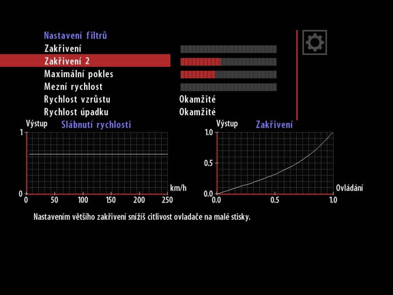 Tim zvysenim zakriveni na ose si snizis citlivost volantu,coz je u takove hry jakou RBR je velka skoda..Zalezi na uhlu otaceni, jake podporuje volant,ale mit takto nastaveny filtr a rozsah 270° to uz je skoro jako na klavesnici