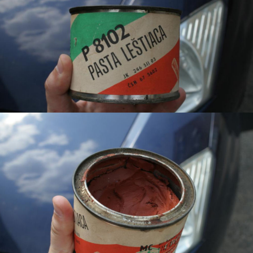 Tak jsem na světla mrknul taky. Udělal jsem to ale trochu jinak. Táta vytáhnul nějakou pastu (viz obrázek), kterou to šlo pěkně. Pak jsem vytáhul i tempo a taky to pomohlo. Ve většině částí jsem nepoužil šmirgl, ale v místech, kde byli "žlutý mapy", tak jsem to pošmrdlal a následně rozleštil tempem nebo tou pastou. Zkoušel jsem a testoval a tempo asi teda vyhrálo. Nakonec jsem to pro jistotu přeleštil McBritem