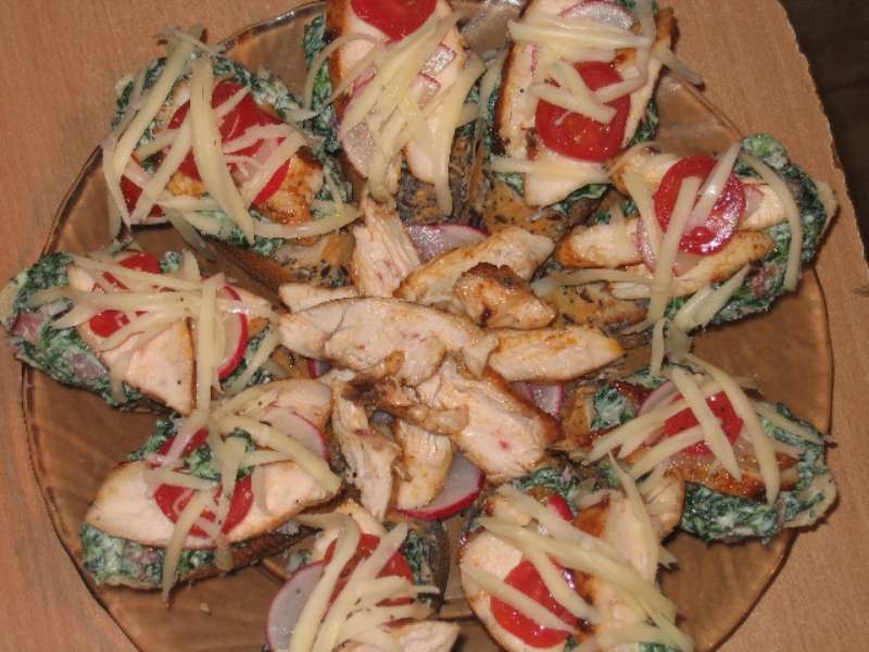 Tak jsem zkoušela zase něco nového.Je to kuřesí maso na bagetce s e špěnátem.Listový špenat jsem orestovala se anglickou slaninou osolila a nechala odpařit vodu .Po vychladnutí jsem do něj zamíchala riccotu a tuto směs dala na plátky celozrné bagety.Kuřecí prsa v celku jsem naložila do oleje s grilovacím kořením a solí osmažila dozlatova.Nakrájela na tenké plátky a položila na bagetky se špenatem na to dala ředktvičky a cherry rajčátka a zasypala nastrouhaným sýrem ,ješě jsem to může dát zapec