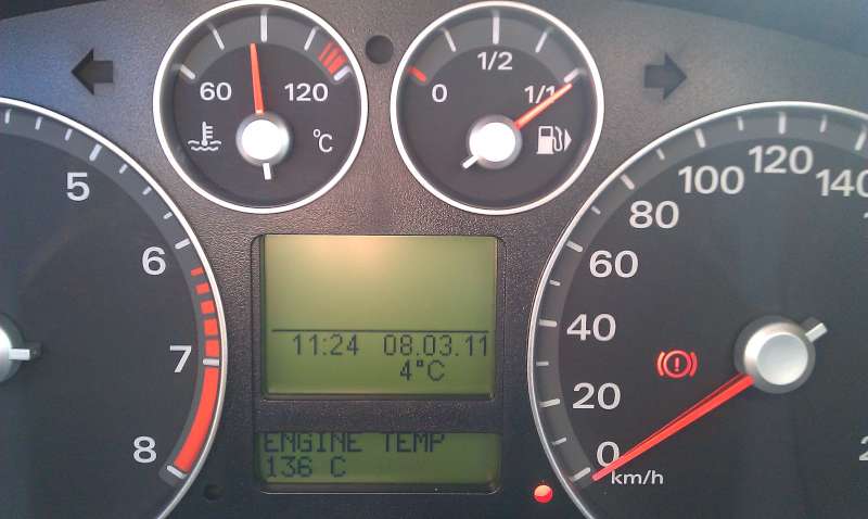 Dnes jsem schválně také dělal test zahřívání svého Duratec HE 2.0 a zjistil jsem jednu zvláštní věc - v "diagnostickém módu BC", kde je jedna z položek teplota motoru, mi to ukazuje podle mě teplotu skoro o 40 st. vyšší než je skutečnost. Když jsem startoval, teplota vzduchu cca 2st, na BC 37. Teplota postupně rostla, rafika teploměru stále dole, vlažný vzduch cca po 500m, po cca 2km téměř skokově rafička vyleze na "střed budíku" - těsně pod 90st. Tady už se pak stabilně drží po celou dobu jízdy. Je zvláštní, že v tu chvíli kdy je na budíku naskočí 90 si teploty cca odpovídají - na BC 87st. Z topení v tu chvíli už "teplý" vzduch" Při další jízdě se již rafička nepohne, ale teplota na BC dále roste - při běžné jízdě se pohybuje cca kolem 125-130, v tu chvíli už z topení "horký vzduch" (cca 4-5km). Když se tomu řádně "naloží" není problém jít přes 130st, max bylo když jsem pak zastavil 137. st.!!