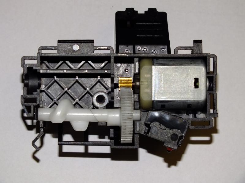 V plastové části bylo hned vidět zlomenou osku s výstupkem, který mačká odjišťovací páčku. Abych rozebral plastovou část, kterou pohromadě držely nožky se zobáčkem, musel jsem pod těmi zobáčky odřezat nálitky. Tyto nálitky tlačí zobáčky do zajištěné polohy. Proto nešly zobáčky promáčknout a odjistit. Po otevření je vidět motorek, osa s vačkou a mikrospinač. Zlomená osa je uvnitř dutá. Vleze se tam vrták o průměru 3 mm. Tedy, ještě jsem to s tím vrtákem pořádně projel aby šel do osy zasunout lehčeji, ale těsně. Pak jsem ještě samotný vrták ve vrtačce vyhladil smirkovým papírem a všechno řádně odmastil. Zlomeninu jsem potřel aktivátorem plastů, jak mi poradil prodavač, když jsem kupoval sadu "Loctite Super Attak All Plastics". Tím jsem vlepil vrták do osy a zároveň slepil osu. Po dvou dnech, až byla zaschnutá barva na svařovaném oku, jsem všechno namontoval zpět a funguje to. Abyste nemuseli jako já odvrtávat oko stačí když si vytisknete tuto šablonu a podle ní vyvrtáte malou dirku tak 2 mm do plastu. Papír ustřihněte podle horní černé rovné čáry. Když pak tuto hranu dorazíte do rožku na plastovém krytu, mělo by vše sedět a můžete vrtat dirku. Tím se dostanete do otvoru označeného šipkou a zatlačením ve směru šipky odjistíte zámek. Hodně zdaru.