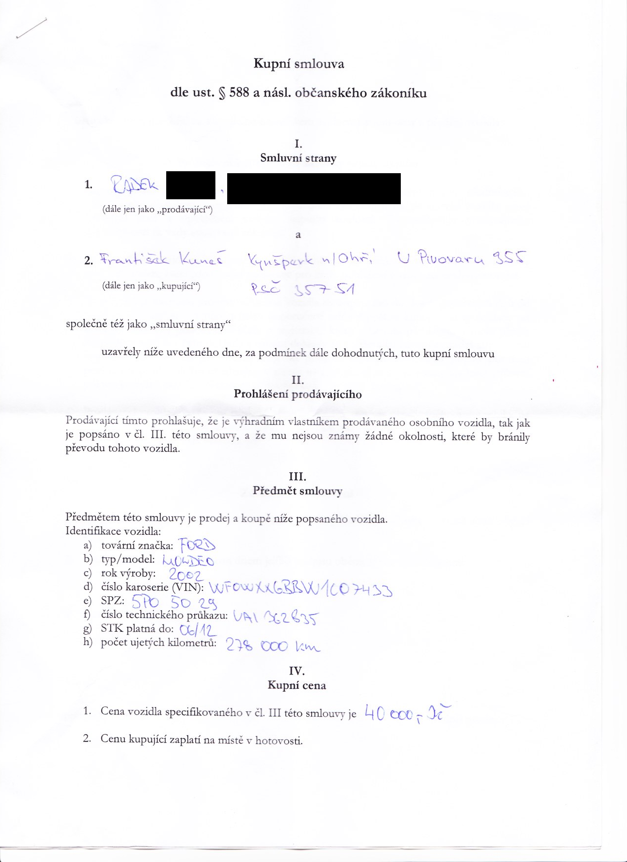Stojí-li ve smlouvě, že Vás prodávající plně seznámil s technickým stavem vozidla, nehraje roli. Jednáme v rovině vady, která vyšla dodatečně najevo (= již byla na voze v momentě prodeje, leč nemohl jste ji odhalit při přebírání vozu, prodávající Vám ji zamlčel...) – „skrytá vada“,.