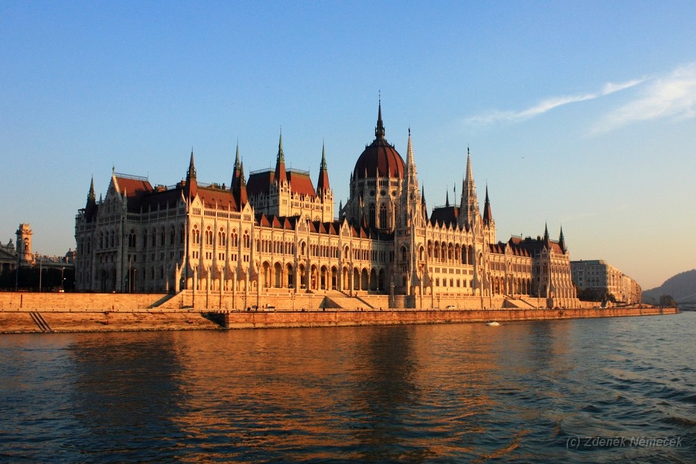 Na palubě mají audio průvodce do sluchátek včetně češtiny, takže konečně změna oproti němčině, co jsme slyšeli (a moc nerozumněli) dopoledne v autobuse. Pomalu se blížil západ slunce, takže památky na břehu Dunaje byly úžasně nasvíceny (hlavně Parlament) a byla to pěkná podívána. Se západem slunce se taky trošku ochladilo, ale že bych si kvůli musel odepřít točený Budvárek, co se servíroval na palubě, tak to ani náhodou