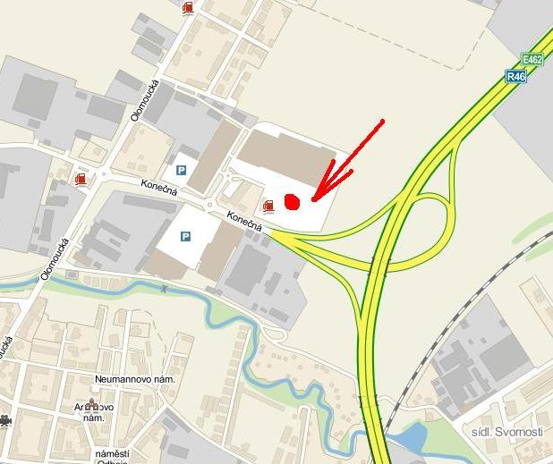 Sjezd k Tescu je hned od dálnice R46 jak ze směru Olomouc, tak od Brna, ztratit se, je nemožné