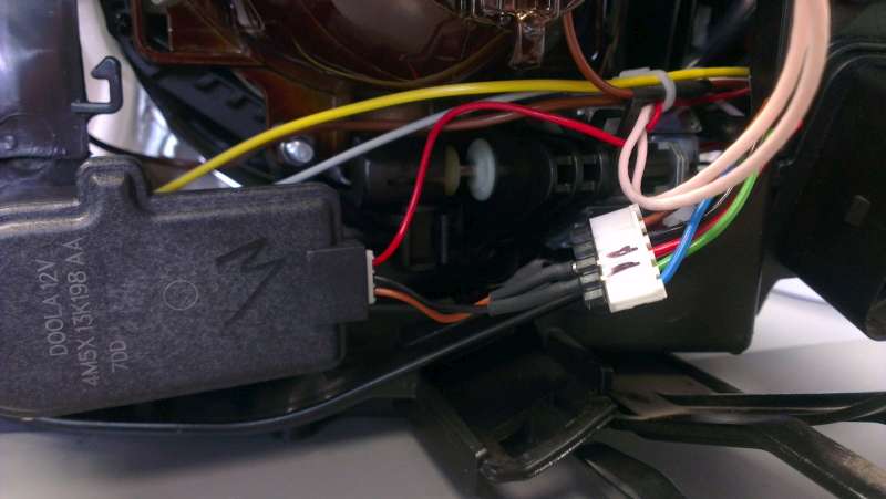 1.) vydloubnete 2-pin konektor a jeho gumovou průchodku ze světla, tím zjistíme, že dva dráty vedou do motoru naklápění (černá a hnědá)