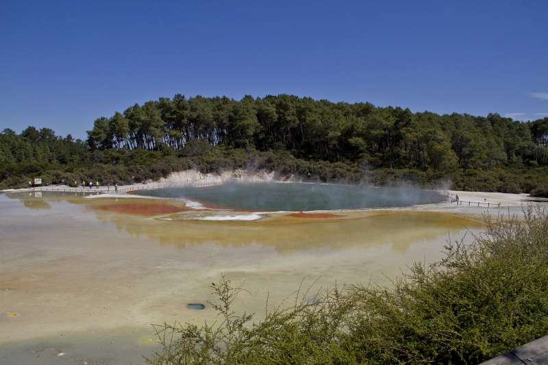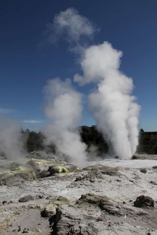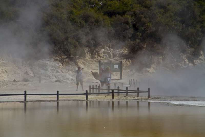 Další den ráno jsme vyrazili směrem Rotorua. Je to město kolem kterého je vysoká geotermální aktivita. Byli jsme se podívat v národní parcích Waimanga, Waiotapu a také Te Puia. Ve Waimangu bylo jezero, ze kterého se kouřilo a všude byl cítit pach sirovodíku. Jako skažený vajíčka. Různě tam taky ze skal šla pára, potoky bublaly, občas někde minigejsíry, všude síra atd. Z fotek to asi tak nevyzní, ale bylo to opravdu zajímavé u toho být. Waiotapu bylo hodně podobné. Tam mě hlavně zaujalo jezírko zvané Champagne pool ze kterého se kouřilo a bublalo až až a taky pach sirovodíku byl opravdu velký. Jezírko bylo po stranách takové zrzavé, ale voda byla krásně čístá. Večer jsme dorazili do kempu, kde jsme si dali koupel v místních horkých bazénech. Další den nás čekala Te Puia. To je Maorské městečko (Maorové jsou původní obyvatelé Nového Zélandu) kde se koná i jejich vystoupení – šlo jen o seznámení s naším “kmenem” a pak předváděli jejich tance atd. Dále tam je také gejsír který dosahuje výšky až 30 metrů. Nestihli jsme ho přímo, ale jen z dálky. I tak to ale bylo zajímavé.