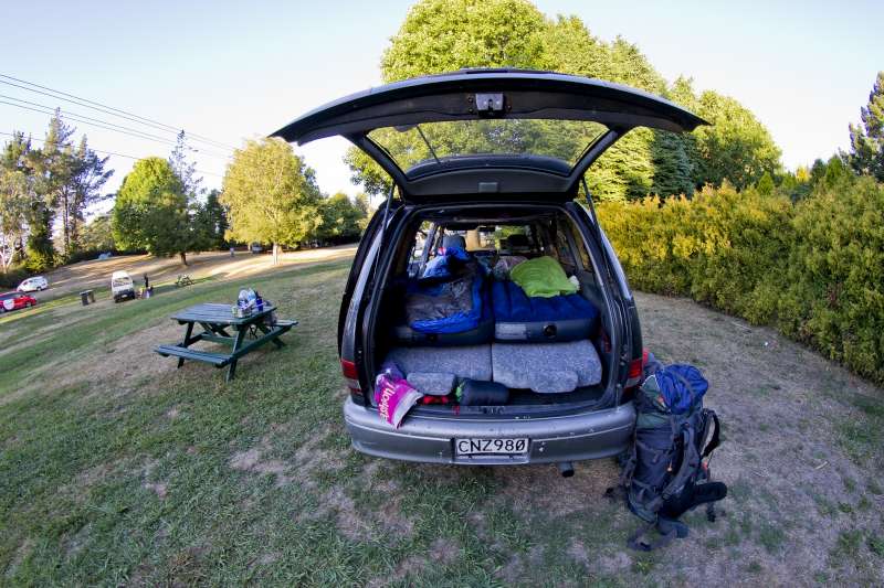 Letěli jsme s Korean air. V letadlech a na letištích jsme ztrávili přes 24 hodin. V únoru na Novém Zélandu mají skoro konec léta. Bylo krásně. Ubytování na první týden jsme měli zařízené přes airbnb.com u jedno moc milého postarší páru. Ten první týden jsme si právě museli zařídit vše jako bankovní účty, NZ mobily a IRD number, což potřebujem, když tu chcem pracovat. A hlavně jsme chtěli sehnat nějaké pěkné, prostorné a spolehlivé auto. V podstatě s ničím nebyl problem. Auto jsme chtěli koupit cca do 3500 NZD a vzhledem k tomu, že tu jezdí nalevo a z Japonska to není daleko, tak je tu spoustu aut dovežených právě z Japonska. Takže volba padla na Toyotu. Potom konkrétně Toyota Estima Lucida, 1995, 2.2l, diesel, automat, 4WD. Jo jo, trochu změna mít diesel a ještě v automatu, ale je to super auto. Má místo pro 8 lidí. Sedačky se dají sklopit do roviny, takže je z toho postel, pak se daj sedačky vzadu dát proti sobě atd atd. Opravdu dobře variabilní.