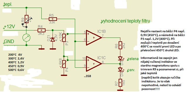 Jde to i jednodušeji, ale má to nevýhody. Totiž, když použijeme starý ručkový indikátor ze starého magnetofonu spolu s trimrem (asi 22K - 47K) v sérii, tak jej lze nastavit tak, že bude ukazovat plný rozsah cca 4V. Pak si na stupnici poznamenat hodnoty 200, 300,.. atd. až třeba 600°C a bude nám ukazovat přímo teplotu. Jediná nevýhoda je v tom, že v provozu si nastartované regenerace nevšimneme. To rozsvícená LED dá o sobě vědět lépe.