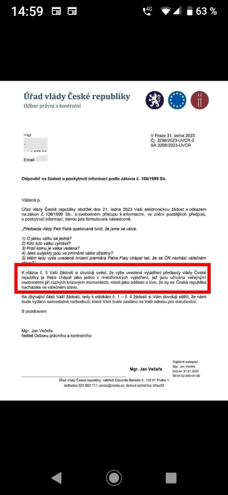 Přirovnání: Fiala taky prohlásil, že jsme ve válce a po oficiálním dotazu přišlo z vlády vyjádření, že to byla jen metafora.