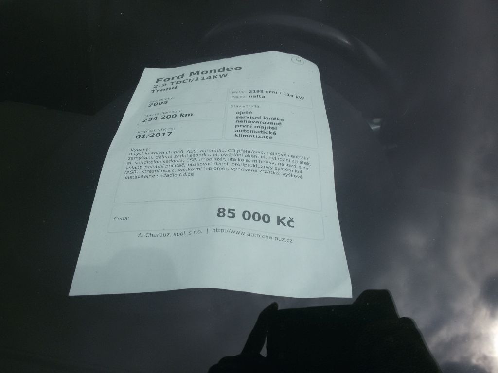 Slid: Přesně, jak jsi napsal, kolem 100 se snad něco "rozumnýho" sežene, nečekám že to bude extra leštěnka , kosmetiku to mít bude není to nové, ale rád bych sehnal něco s prokazatelnou historií a servisem.O to mi jde především. Na jednu stranu bych klidně vzal i tohle Mondeo z fotek na který jsem se byl podívat,ale vyplněná serviska tužkou na mě nepůsobila zrovna vábně...Nějaký mouchy to mělo,ale to nejdůležitějši bylo udělaný(jestli se tomu dá věřit)...