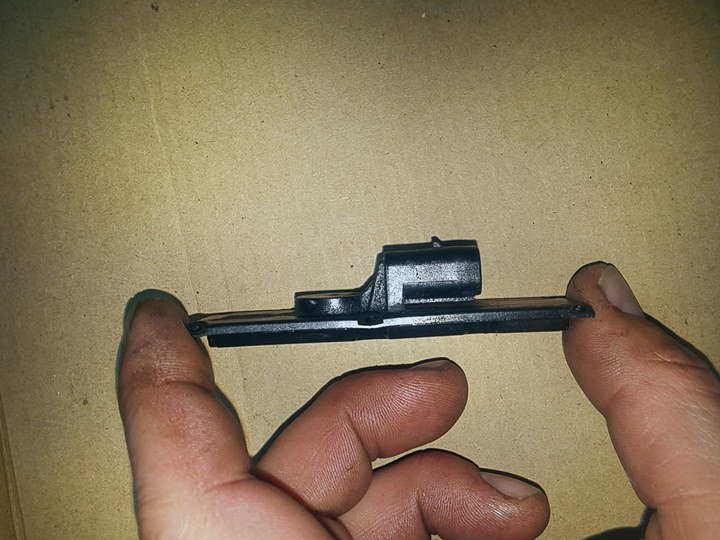 Originál jsem rozšrouboval a odstranil vstup pro konektor.Vypiloval jsem díru pro nový spínač,který jsem přilepil tavnou pistolí.Dorazový plast jsem zabrousil podle potřeby a podložil jsem ji kouskem tvrdší gumy,aby spínač reagoval po celé délce a ne jen v určitém bodě.