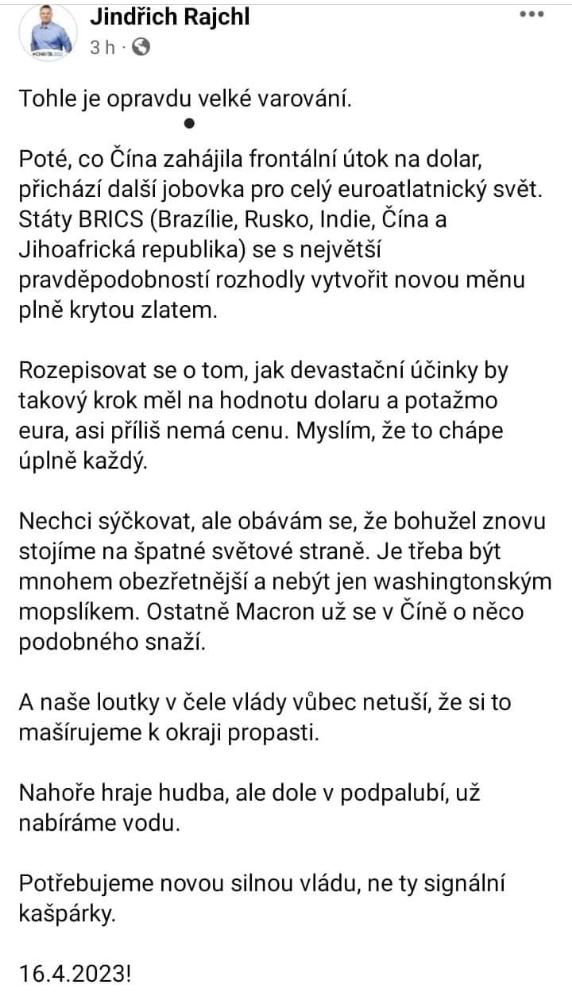 Je dobrej lhář a méně chápavá část obyvatel mu to žere.Žádná z jeho katastrofických vizí nevyšla.Bez plynu z Ruska a též jadernýho paliva odtamtud se obejdeme,paliva nestála a nestojí stovku za litr,měna plně krytá zlatem je holej nesmysl atd atd.Když jsem se sním snažil vést diskusi a vyvrátil jsem mu ty nesmysly dostal jsem ban