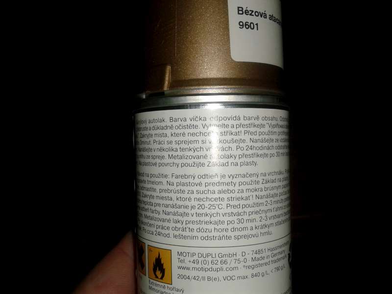 Tak mám koupit ještě základní barvu ve spreji... ten nechat dle popisku zaschnout a pak stříknout barvu třeba dvakrát,tak aby to bylo zakryté a krycí lak ještě na nezashnutou barvu třeba do třech vrstev. Tak to byl v té prodejně fakt odborník... I pro lak jsem tam musel zvlášť...