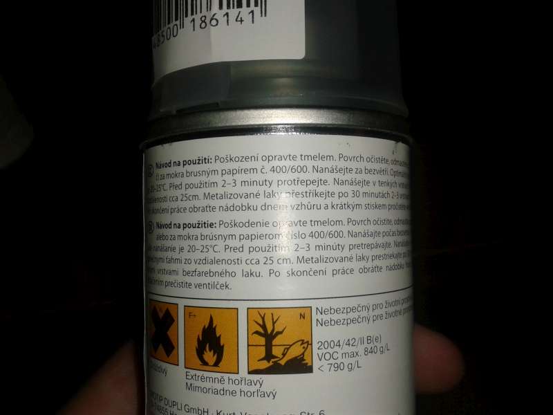 Tak mám koupit ještě základní barvu ve spreji... ten nechat dle popisku zaschnout a pak stříknout barvu třeba dvakrát,tak aby to bylo zakryté a krycí lak ještě na nezashnutou barvu třeba do třech vrstev. Tak to byl v té prodejně fakt odborník... I pro lak jsem tam musel zvlášť... :perfect: :roll: