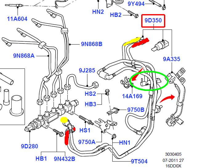 Vlevo dole je žlutě označen výstup z paliváku do čerpadla, to rozdělám a dám do nádoby s čistidlem. Aby se to nevrátilo do nádrže tak rozpojím spojku označenou vpravo nahoře žlutou barvou, a to dám taky do nádoby s čistidlem. Přepad ze vstřikovačů jde do "rozdělovače" v zeleném kroužku, takže to je v pohodě.