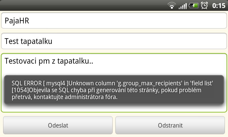 Pro prohlizeni fora na mobilu uz pouzivam jen tapatalk.Jsem s nim velice spokojen,ovsem jsem narazil na problem pri pokusu o odeslani PM pres nej(viz foto).