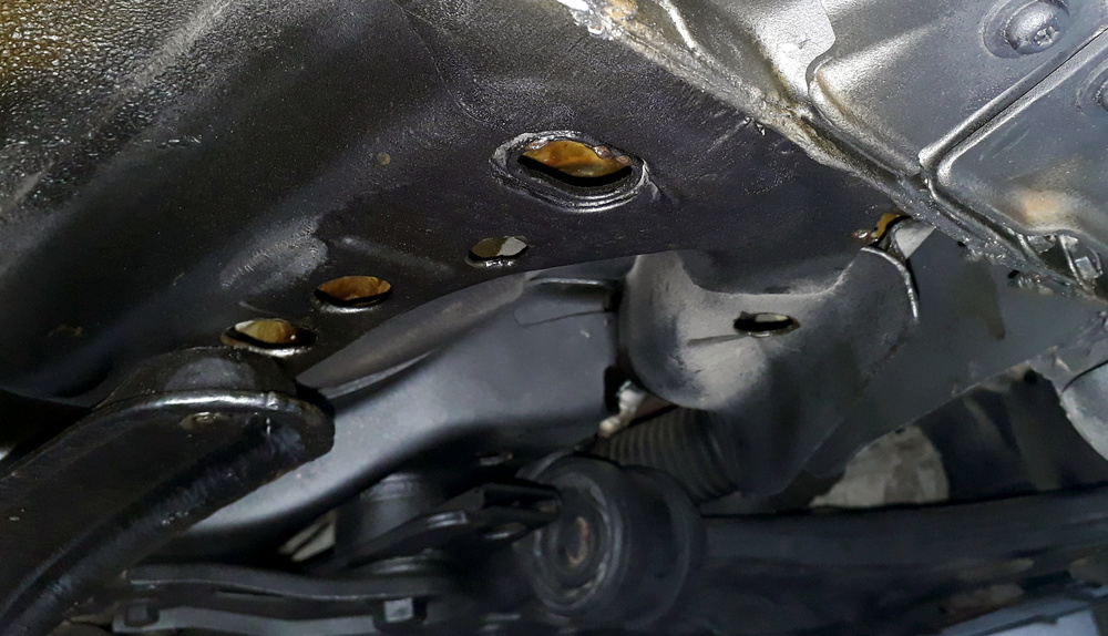 prahy - opět stejný kaučukový sprej (tlustá vrstva s ochranou proti kamínkům, na některých místech už to bylo odřené na kov od zvedání auta při přezouvání) podběhy - také kaučukový sprej - zejména spodní část tlumiče a kovový kryt ložiska byly už hodně rezavé, dále pro jistotu ještě šroubení u brzdové hadičky a nějaké ty tyčky (jinak spodní nápravnice byla stříknutá asi před měsícem a brzdové třmeny tepelně odolnější základovou barvou před 2 lety - zatím +/- OK...) nápravy - ten klasický bitumen (subjektivně tenčí, než kaučuk, povrchově se mi zamlouvá, vypadá elasticky, uvidíme po 2 zimách) dutiny (různé duté díly náprav, zadních nosníků atd., tak prahy skrz gumové záslepky) - vosk do dutin ostatní - např. plstěný podběh zadního kola, díly zavěšení kola v podběhu atd. - hustější vosk na podvozek (ten jsem měl bohužel jen ve světle hnědé barvě, takže to z dálky vypadá trochu jako koroze