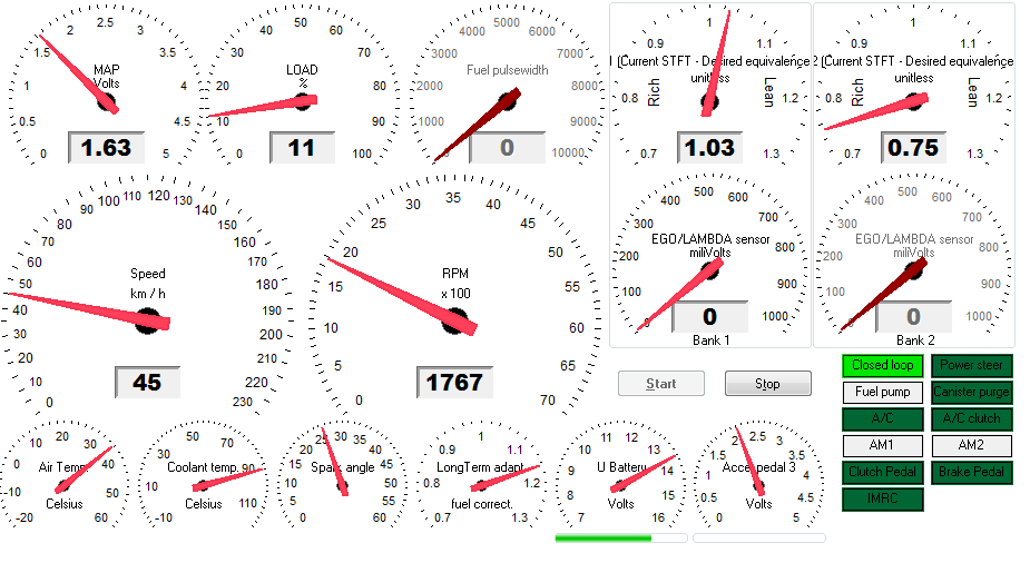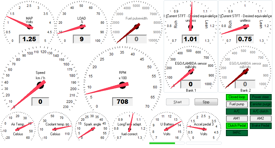Dalej prikladam budiky za jazdy ustalenou rychostou: Pri brzdeni motorom kratkodoba korekcia 1. a 2. lambdy (STFT) je presne 1.00 (to je ok).