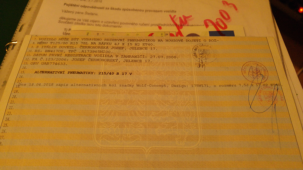 Tak se mi cca po 6ti letech podařilo Wolf 17 dostat do velkého TP na Focuse MK1 1.6. Našel jsem stránku https://www.typove-listy.cz/. Cena typového listu je docela vysoká, 2 420,-, nicméně recenze jsou velmi dobré a tak jsem to zkusil. Na 2 ze 3 STK měli problém s nějakým číslem, ale na 3tí STK se jen podívali a už jsem jel dovnitř, technik se podíval, jestli to někde nedře a vystavil mi potvrzení pro dopravku. Na dopravce paní volala pánovy, který mi typový list vystavil, zda tak skutečně učinil a jestli jsem si to nějak nevyrobil sám