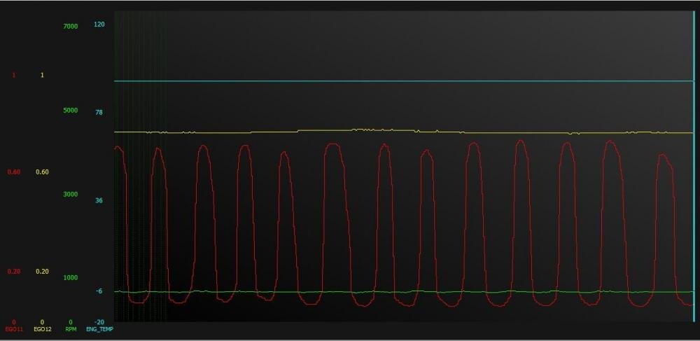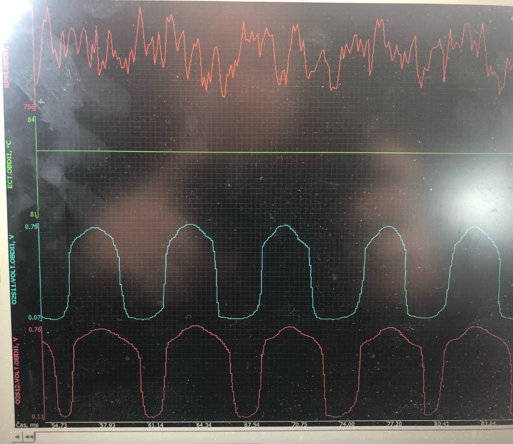 Ahoj, prosím o radu. Takhle vypadá křivka průběhu napětí na přední a zadní lambda sondě (po zahrátí, volnoběžné otáčky):