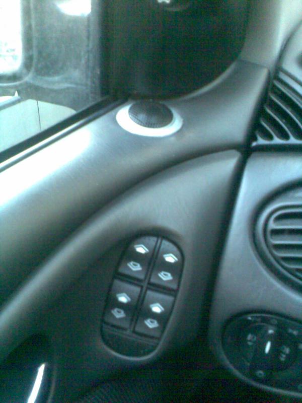 Tak jsem dneska pokračoval ve vylepšování aparatůry ve Fofíkovi.Po dlouhém uvažování jestli komponentní,nebo koaxiální repro, jsem dal na radu odborníku a koupil komponentní(oddělené výšky prý hrajou lépe).Druhá věc byla kam s těma výškama, když na tapecu není kousek volného a rovného místa(o umístění na palubovku jsem neuvažoval).Nakonec jsem se rozhodl pro: viz foto.Myslím že to dopadlo dobře, a hraje to super good.Vzadu mám zatí origo, ale taky na ně dojde.