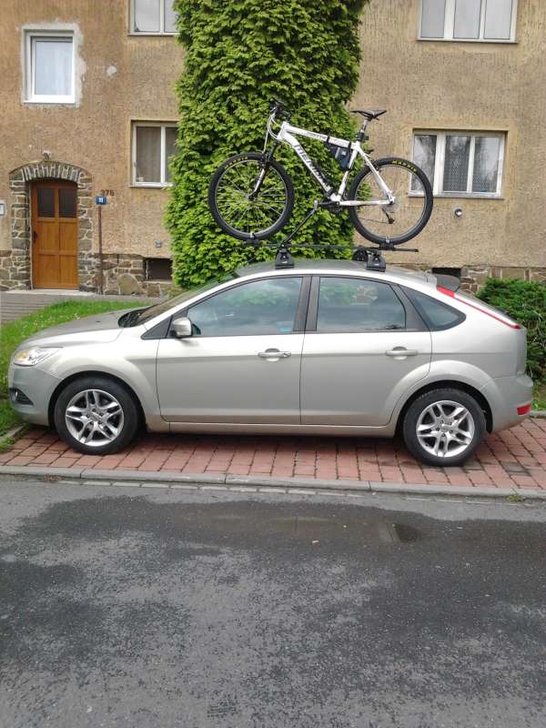 Tak jsme si taky pořídili střešní nosič a držáky na dvě kola. Díky všem za rady s montáží příčníku. Je to naše premiéra s kolama na střeše, tak doufam, že je to bezpečné a neuletí to. Foto je jen s jedním kolem protože přišla buřina a tak jsem nestihl namontovat druhý držák.