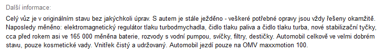 nevim jestli se to da nazvat ze bylo o nej perfektne starano kdyz ho mel rok a udelal to co se melo delat pred 30t km - rozvody , to dalsi je bezny spotrebak - desticky , tycky , baterka , a dily ktere odejdou starim a najezdem - ventil turba a cidlo tlaku paliva . takze nic co by se dalo nazvat perfektni peci .