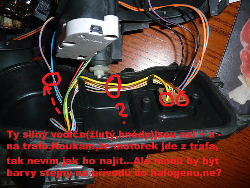 kota ja som to riesil takto ... tie kable od motorceku (v modrom kruhu ) som cvakol a pripajkoval na tie kable co ostali v tom zvazku (tam kde ide sipka) a tak som obisiel trafo a vyviedol tie dratky von z lampy a potom uz len pripajkoval k tym na halogenovej koncovke. ak sa dobre pametam v tom zvezku som pouzil biely kabel s cervenym pruhom a este jeden ale to uz neviem ... no kazdopadne v tom zvezku co idu do trafa su kable ktore nebudes potrebovat (kedze nemas nivalaciu) a tak tie kable cvakni a pripajkuj k motorceku a tak obides trafo... ja to mam tak spravene a slape to na jednicku