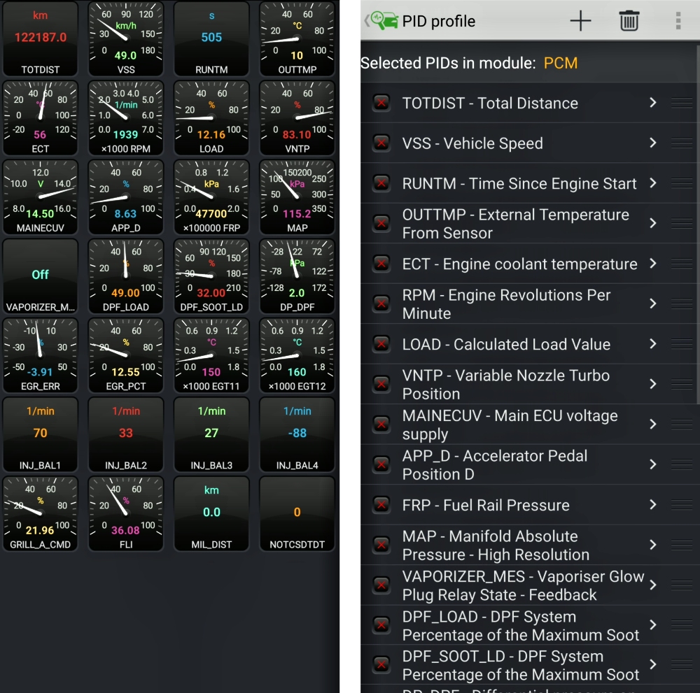 Moje základní občasné diagnostikování jízdy pomocí aplikace ForScan Lite, která je pro mě postačující a přehledná. Používám kvalitní lepší adaptér českého půvou ve verzi BT/USB od Tomina z ForDiag, který v rozumné ceně dodává i software k možností zápisu dat jako osciloskop či nastavování hodnot auta. Pokud máte o toto zájem, domluvte se na dodání BT i USB rozhraní pro jeden převodník. Doporučuji převodníky dva, to přehazování je otravné. Můj telefon umí nahrávat screenrecord, tedy data mám k pozdějšímu čtení a je to přehledné.