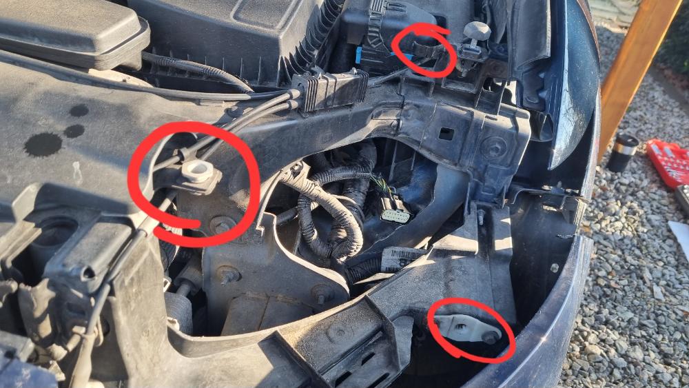 Vypíchneme dva špunty na krajích (u světla co nedemontuješ nemusíš), pak 4 menší špunty, které jsem nezakroužkoval ale jsou ve stejné úrovni co zbytek, a vyšroubujem 3x torx
