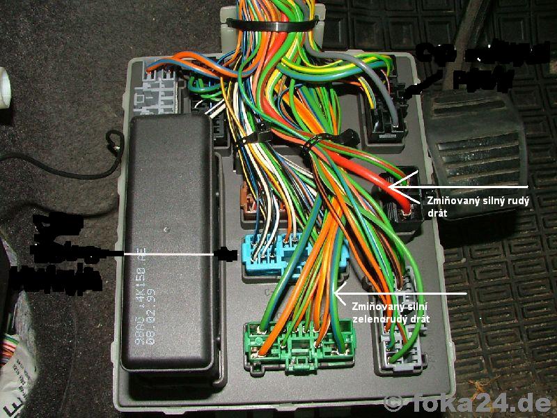 Zdravím. Foto bohužel není možné nebo alespoň né v nejbližší době , neboť nevlastním digi foto. A k těm oknúm tak to je tak , že jakmile se vypne motor a klíček zůstane v poloze že nesvítí kontrolky tak stačí otevřít dveře(záleží na tom,jestli se budou zapojovat všechny dveřní kontakty nebo jen řidičův) a v tom okamžiku je možné okna zavřít pomocí spínače běžným způsobem. V žádném případě to není tak , že by se okna samy zavřely.Teď mě napadlo že zkusím připojit fotku z německých stránek s popisem.Těch začerněných míst si nevšímejte.Doufám že autor snímku a admin promine