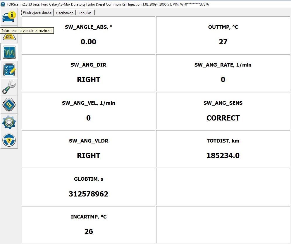 Spustil jsem proto kalibraci senzoru natočení volantu, která napotřetí proběhla úspěšně a kontrolka zhasla. PO cca dvaceti kilometrech se rozsvítila znovu (rozjezd z křižovatky s koly v levém rejdu).